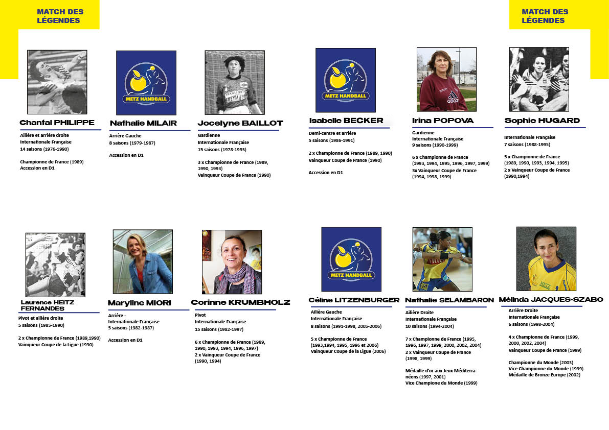 Le match des légendes débutera à 17H et durera 2 x 20 min, il sera arbitré par Thierry Weizman, Président de Metz Handball et Jacques Bettenfeld, Président de Metz Handball Association. L’accès au match se fera uniquement avec un billet de match de Metz vs Chambray.